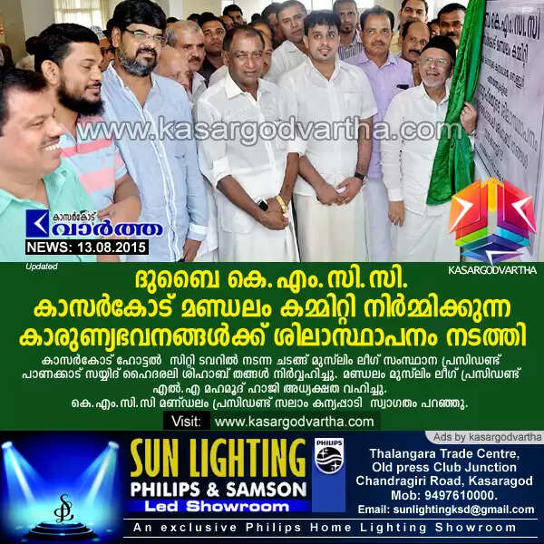 Keywords: Dubai KMCC Kasaragod Mandalam Committee, Panakkad Sayyid Hyder Ali Shihab Thangal, Inauguration, KMCC Baithurahma foundation stone laid, Advertisement Sun Light, Philips and Samson.