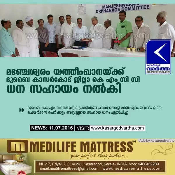 മഞ്ചേശ്വരം യത്തീംഖാനയ്ക്ക് ദുബൈ കാസര്‍കോട് ജില്ലാ കെ എം സി സി ധന സഹായം നല്‍കി