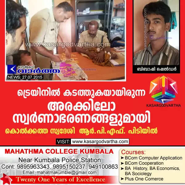 Keywords: Gold Seized, Kerala, Kolkata native held with gold, Train, Police, Arrest, Advertisement Mahathma College.