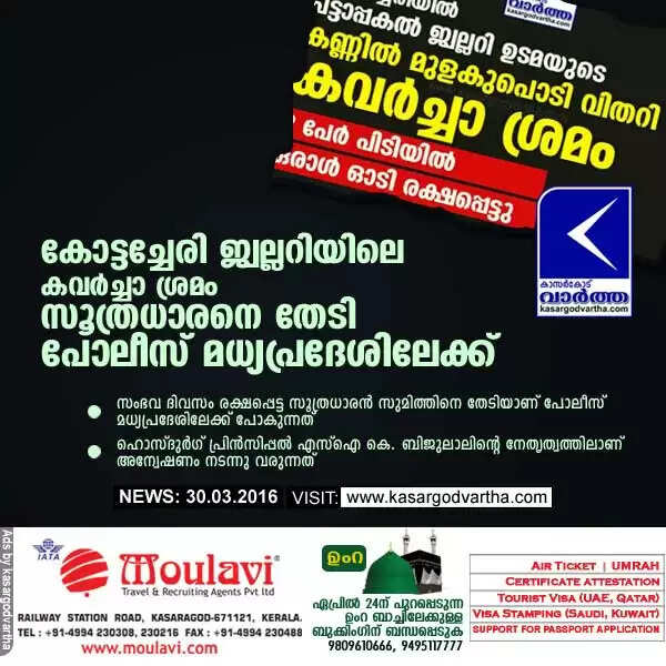 കോട്ടച്ചേരി ജ്വല്ലറിയിലെ കവര്ച്ചാ ശ്രമം: സൂത്രധാരനെ തേടി പോലീസ് മധ്യപ്രദേശിലേക്ക്