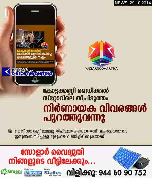 Keywords : Kasaragod, Kerala, Fire, Shop, Police, Investigation, Kottakkanni, Kottakkanni medical shop fire: awaiting forensic report.