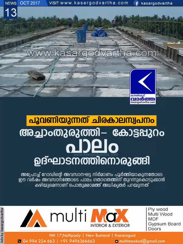 Keywords: Kasaragod, Kerala, news, inauguration, Neeleswaram, Kottappuram Bridge construction in final stage