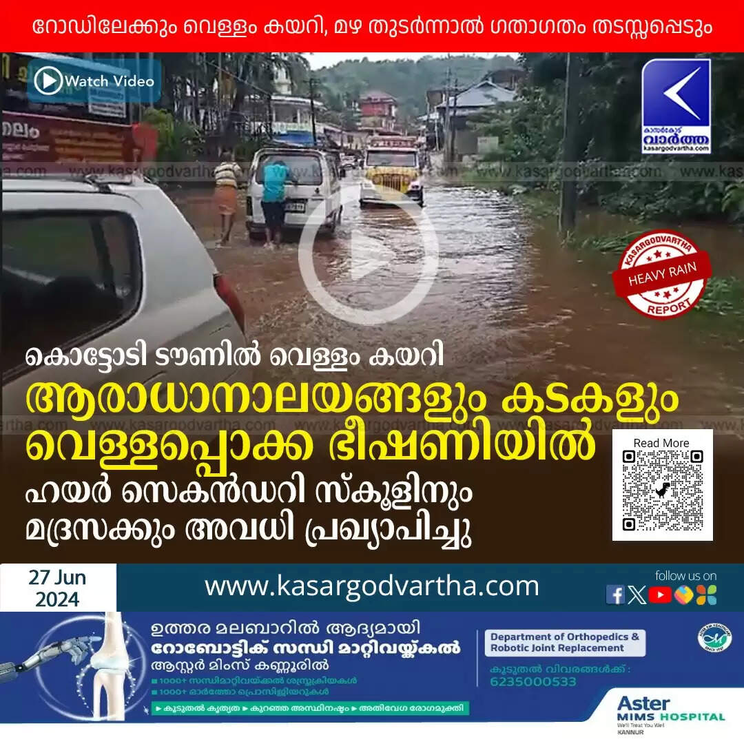 Heavy Rain | കൊട്ടോടി ടൗണില് വെള്ളം കയറി; ആരാധാനാലയങ്ങളും കടകളും വെള്ളപ്പൊക്ക ഭീഷണിയില്, ഹയര് സെകന്ഡറി സ്കൂളിനും മദ്രസക്കും അവധി പ്രഖ്യാപിച്ചു