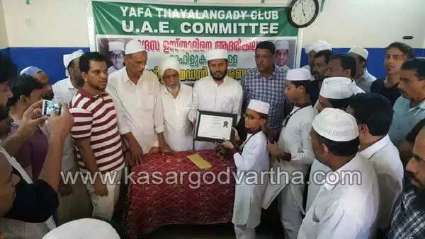 കാസര്‍കോട്: (www.kasargodvartha.com 03.07.2016) യഫ തായലങ്ങാടിയും യഫ യുഎഇ കമ്മിറ്റിയും ചേര്‍ന്ന് 21 വര്‍ഷം സേവനമനുഷ്ടിച്ച മദ്രസാധ്യാപകന്‍ കെ പി സുലൈമാന്‍ മുസ്ലിയാരെ ആദരിക്കലും തായലങ്ങാടിയിലെ ഖുര്‍ആന്‍ മനപാഠമാക്കിയ മുര്‍ഷിദ് മനാഫ്, മുനീബ് മനാഫ് എന്നിവരെ അനുമോദിക്കല്‍ ചടങ്ങും നടന്നു.