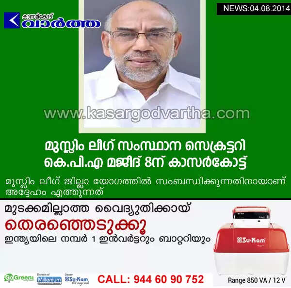 മുസ്ലിം ലീഗ് സംസ്ഥാന സെക്രട്ടറി കെ.പി.എ മജീദ് 8ന് കാസര്കോട്ട്