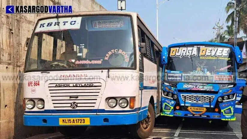 Article Summary: A collision occurred between a KSRTC bus and a private bus on the narrow service road in Mogral Puthur town due to competitive driving, completely halting traffic for half an hour, though no injuries were reported.