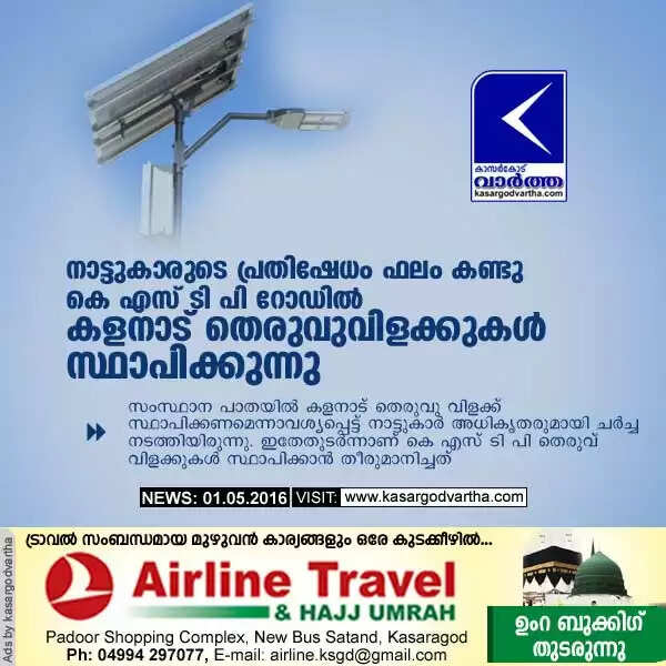 നാട്ടുകാരുടെ പ്രതിഷേധം ഫലം കണ്ടു; കെ എസ് ടി പി റോഡില് കളനാട് തെരുവുവിളക്കുകള് സ്ഥാപിക്കുന്നു