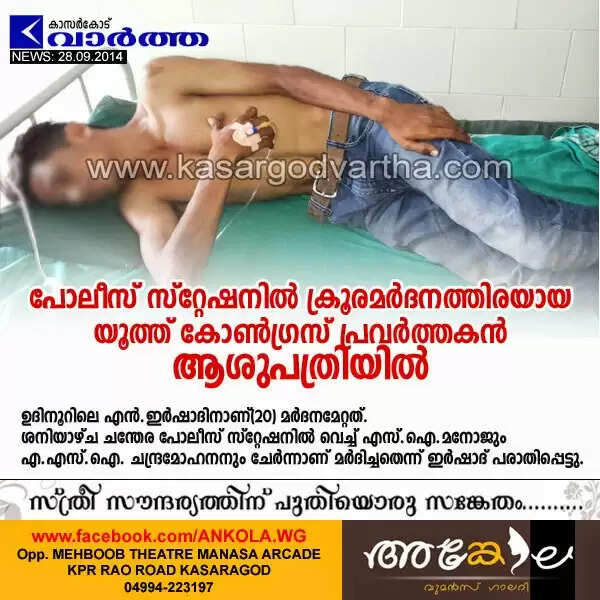 ചെറുവത്തൂര്‍:(www.kasargodvartha.com 28.09.2014) യൂത്ത് കോണ്‍ഗ്രസ് പ്രവര്‍ത്തകനെ പോലീസിന്റെ ക്രൂരമായ മര്‍ദനമേറ്റ് അവശ നിലയില്‍ ചെറുവത്തൂരിലെ സ്വകാര്യാശുപത്രിയില്‍ പ്രവേശിപ്പിച്ചു. ഉദിനൂറിലെ എന്‍.ഇര്‍ഷാദിനാണ്(20) മര്‍ദനമേറ്റത്. ശനിയാഴ്ച ചന്തേര പോലീസ് സ്‌റ്റേഷനില്‍ വെച്ച് എസ്.ഐ.മനോജും എ.എസ്.ഐ. ചന്ദ്രമോഹനനും ചേര്‍ന്നാണ് മര്‍ദിച്ചതെന്ന് ഇര്‍ഷാദ് പരാതിപ്പെട്ടു.