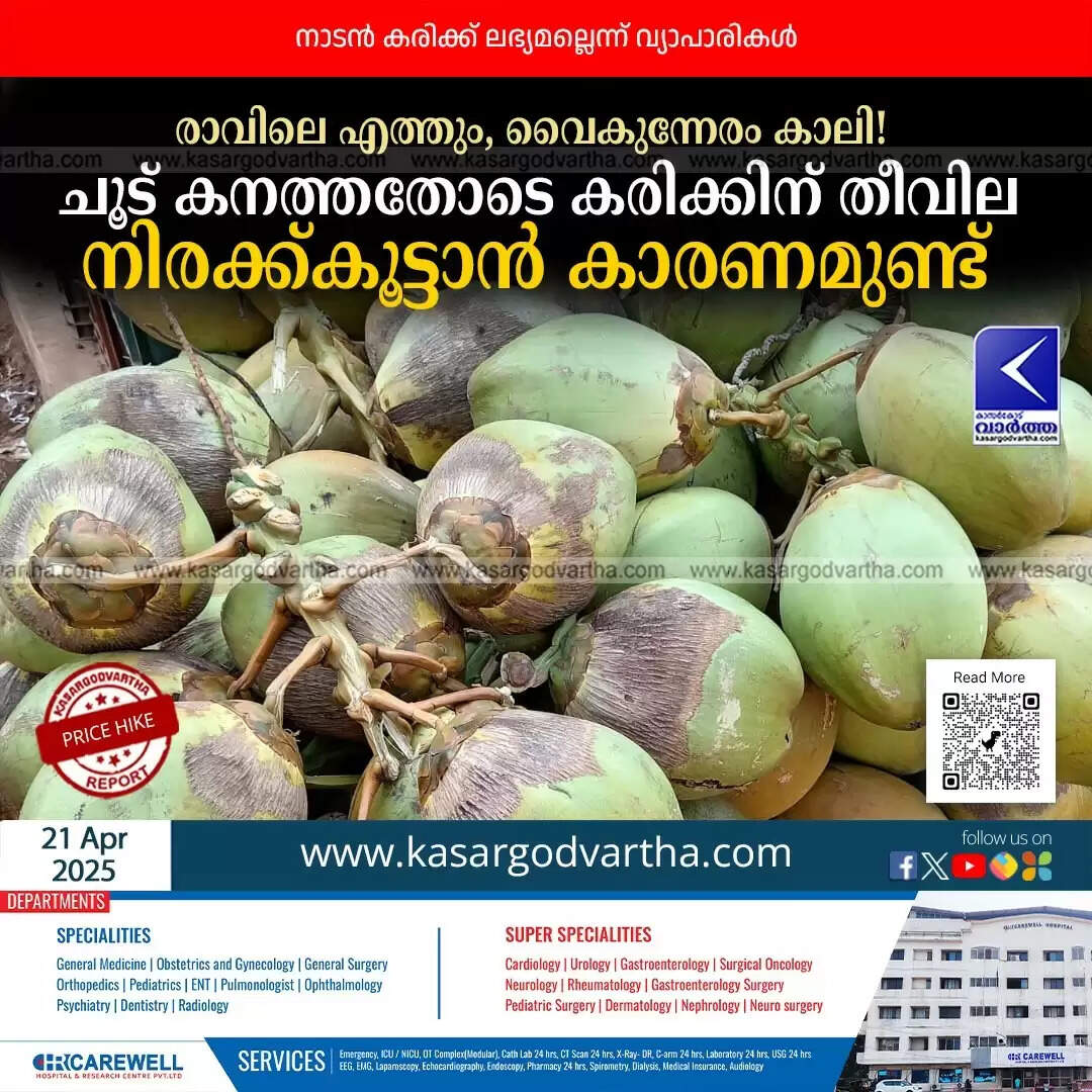Summary: Coconut water prices in Kumbala have surged to ₹60 due to increased demand caused by the intense heat. The supply mainly comes from Tamil Nadu, as supplies from Karnataka have decreased due to higher demand in Mumbai.