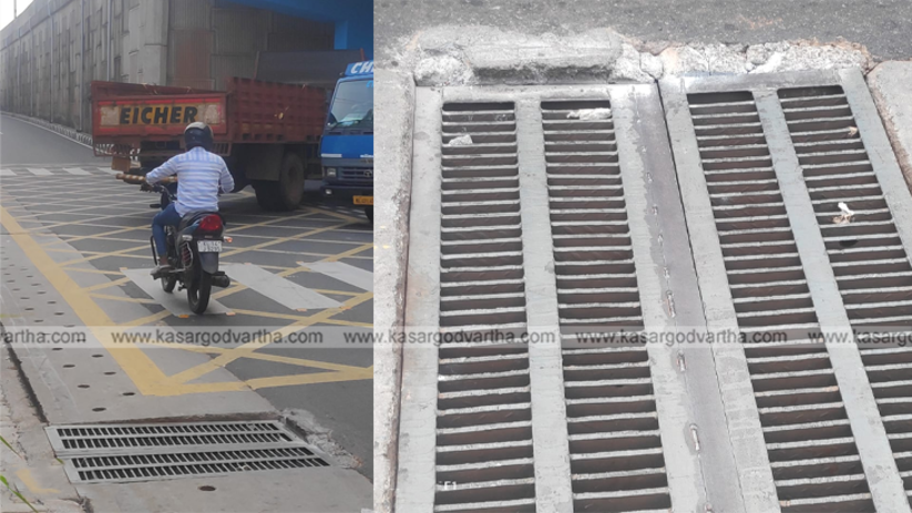 Article Summary: Broken concrete/tarmac near Kumbla National Highway service road drain poses accident risk; locals demand repair.