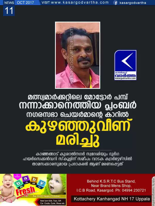 കാഞ്ഞങ്ങാട്: (www.kasargodvartha.com 11.10.2017) മത്സ്യമാര്‍ക്കറ്റിലെ മോട്ടോര്‍ പമ്പ് നന്നാക്കാനെത്തിയ പ്ലംബര്‍ നഗരസഭാ ചെയര്‍മാന്റെ കാറില്‍ കുഴഞ്ഞുവീണ് മരണപ്പെട്ടു. കാഞ്ഞങ്ങാട് കുശാല്‍നഗര്‍ സ്വദേശിയും ദുര്‍ഗ ഹയര്‍സെക്കന്‍ഡറി സ്‌കൂളിന് സമീപം വാടക ക്വാര്‍ട്ടേഴ്സില്‍ താമസക്കാരനുമായ പ്രഭാകരന്‍ (45) ആണ് മരണപ്പെട്ടത്. ചൊവ്വാഴ്ച രാത്രി 9.30 മണിയോടെയാണ് സംഭവം.