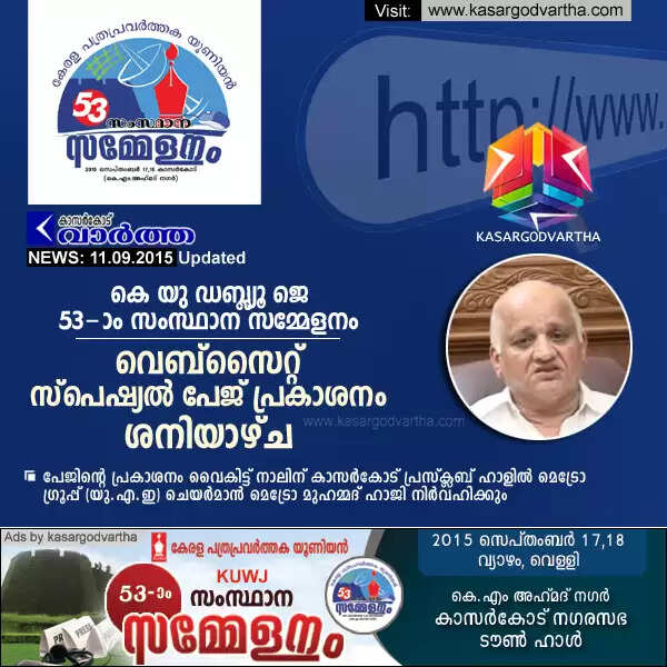 Keywords: Kasaragod, Kerala, KUWJ, Conference, Web site, Metro Mohammed Haji, KUWJ State conference: website inauguration on Saturday.