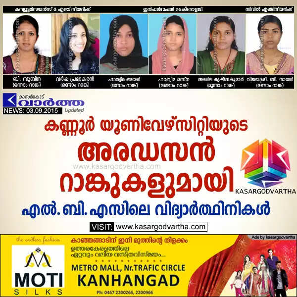 കാസര്‍കോട്: (www.kasargodvartha.com 03/09/2015) കണ്ണൂര്‍ യൂണിവേഴ്‌സിറ്റിയുടെ ഈ വര്‍ഷത്തെ ആറ് റാങ്കുകള്‍ പൊവ്വല്‍ എല്‍.ബി.എസ്. എഞ്ചിനീയറിംഗ് കോളജ് വിദ്യാര്‍ത്ഥികള്‍ കരസ്ഥമാക്കി. കമ്പ്യൂട്ടര്‍ സയന്‍സില്‍ ഒന്നും രണ്ടും റാങ്കുകളും, സിവില്‍ എഞ്ചിനീയറിംഗില്‍ രണ്ടാം റാങ്കും, ഇന്‍ഫര്‍മേഷന്‍ ടെക്‌നോളജിയില്‍ ഒന്നും രണ്ടും മൂന്നും റാങ്കുകളുമാണ് ലഭിച്ചത്.