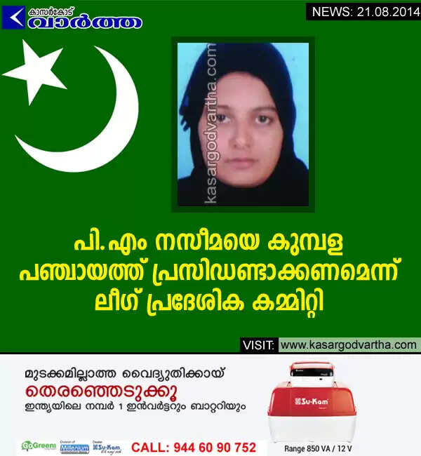 കുമ്പള: (www.kasargodvartha.com 21.08.2014) കുമ്പള ഗ്രാമപഞ്ചായത്ത് വികസന കാര്യ സ്റ്റാന്‍ഡിംഗ് കമ്മിറ്റി ചെയര്‍പേഴ്‌സണ്‍ പി.എം നസീമയെ പുതിയ പഞ്ചായത്ത് പ്രസിഡണ്ടായി നിയമിക്കണമെന്ന് ലീഗ് പ്രദേശിക കമ്മിറ്റി മേല്‍ഘടകത്തോട് അവശ്യപ്പെട്ടു. മുസ്ലിം ലീഗ് ബംബ്രാണ ഒമ്പതാം വാര്‍ഡ് കമ്മിറ്റി യോഗമാണ് ഇക്കാര്യം മേല്‍കമ്മിറ്റിയോട് ആവശ്യപ്പെട്ടത്.