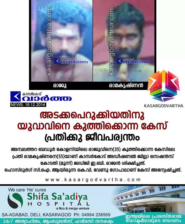 കാസര്‍കോട്: (www.kasargodvartha.com 18.12.2014) പാട്ടത്തിനെടുത്ത കവുങ്ങിന്‍ തോട്ടത്തില്‍ നിന്നു അടക്ക പെറുക്കിയതിനെ ചൊല്ലിയുള്ള വൈരാഗ്യത്തില്‍ യുവാവിനെ കുത്തിക്കൊന്ന കേസിലെ പ്രതിയെ കോടതി ജീവപര്യന്തം തടവിനും 25,000 രൂപ പിഴയടക്കാനും ശിക്ഷിച്ചു. അമ്പലത്തറ ബഡൂര്‍ കോളനിയിലെ രാജുവിനെ(35) കുത്തിക്കൊന്ന കേസിലെ പ്രതി രാമകൃഷ്ണനെ(45)യാണ് കാസര്‍കോട് അഡീഷണല്‍ ജില്ലാ സെഷന്‍സ് കോടതി (മൂന്ന്) ജഡ്ജി ഇ.ബി. രാജന്‍ ശിക്ഷിച്ചത്.