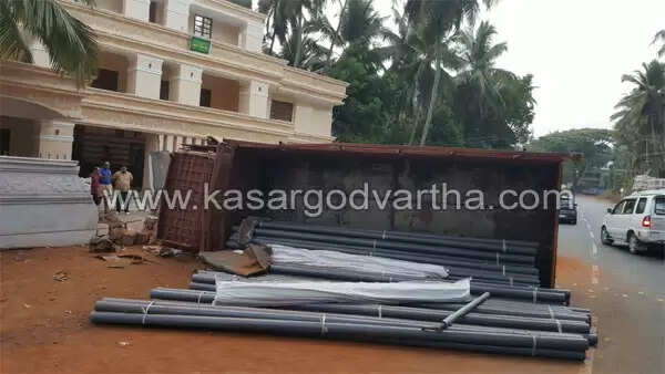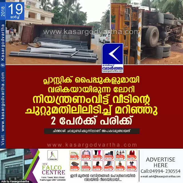 പ്ലാസ്റ്റിക് പൈപ്പുകളുമായി വരികയായിരുന്ന ലോറി നിയന്ത്രണംവിട്ട് വീടിന്റെ ചുറ്റുമതിലിലിടിച്ച് മറിഞ്ഞു; 2 പേര്ക്ക് പരിക്ക്
