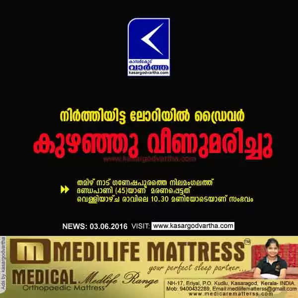 കാസര്കോട്: (www.kasargdvartha.com 03.06.2016) ഭക്ഷണം കഴിക്കുന്നതിന് വേണ്ടി ദേശീയ പാതയ്ക്കരികില് നിര്ത്തിയിട്ട ലോറിയില് ഡ്രൈവര് കുഴഞ്ഞു വീണ് മരിച്ചു. തമിഴ് നാട് ഗണേഷപുരത്തെ നിലമംഗലത്ത് ദണ്ഡപാണി (45)യാണ് മരണപ്പെട്ടത്.