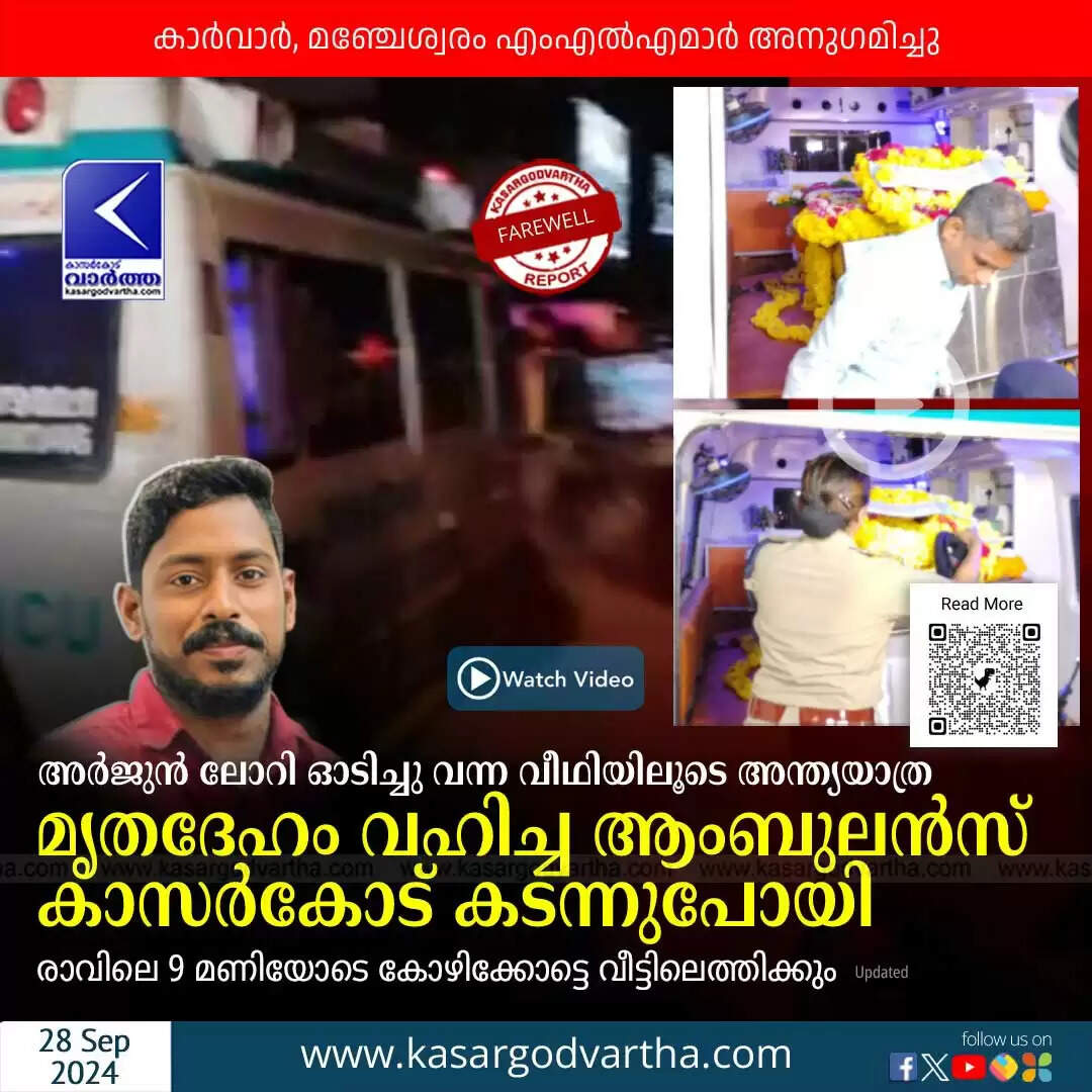 Tragedy | അർജുൻ ലോറി ഓടിച്ചു വന്ന വീഥിയിലൂടെ അന്ത്യയാത്ര; മൃതദേഹം വഹിച്ച ആംബുലൻസ് കാസർകോട് കടന്നുപോയി; പുലർച്ചെ കോഴിക്കോട്ടെ വീട്ടിലെത്തിക്കും
