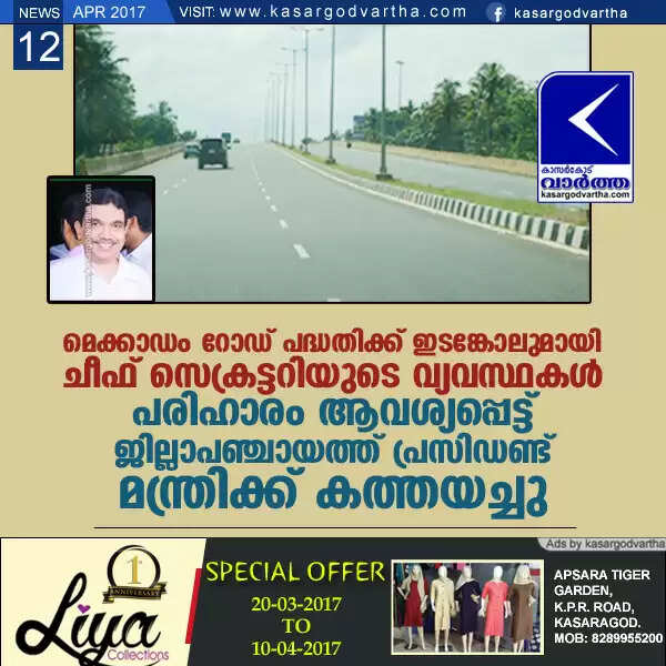 Keywords: Kasaragod, Road, Tender, Report, Chief secretary, District panchayath president, Letter, A.G.C Basheer, Traffic survey, MSA Test, Executive engineer, Remedies, Macadam road; District panchayath president approaches minister.