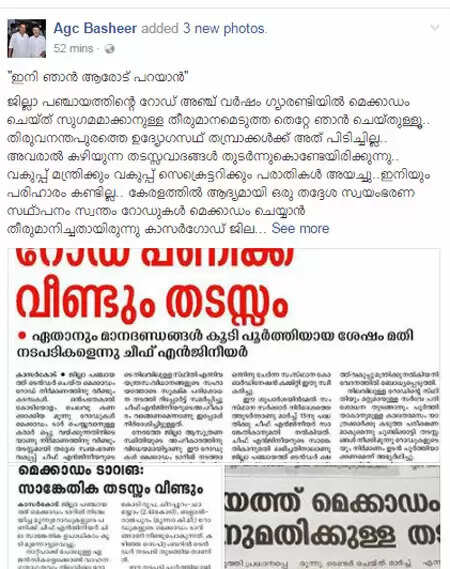 ഇതുസംബന്ധിച്ച് എ ജി സി ബഷീര്‍ വിശദമായ ഫെയ്‌സ്ബുക്ക് പോസ്റ്റ് ഇട്ടിട്ടുണ്ട്. പതിവുപോലെ കാലങ്ങളായി ചെയ്തുവരുന്ന പാച്ച് വര്‍ക്കുകള്‍ ചെയ്ത് കുഴിയടച്ച് പോയാല്‍ മതി. പോരെങ്കില്‍ പേരിന് ജനങ്ങളുടെ കണ്ണുകെട്ടാന്‍ ഒരു ഉപരിതലം പുതുക്കലും. പരമാവധി രണ്ട് വര്‍ഷം കാലാവധി, ഇത് തുടര്‍ന്ന് കൊണ്ടേയിരിക്കണം. പൊതുജനങ്ങളുടെ നികുതിപ്പണം ഇങ്ങനെ പാഴാക്കിക്കളയണം. ഇതാണ് തിരുവനന്തപുരത്തുനിന്നുള്ള ഓര്‍ഡര്‍. അഞ്ച് വര്‍ഷത്തെ കാലാവധിയില്‍ റോഡ് പണി മെക്കാഡം ചെയ്യാന്‍ നിങ്ങള്‍ക്കെന്തധികാരമെന്നാണ് ചോദ്യം. എ ജി സി ബഷീര്‍ ഫെയ്‌സ്ബുക്ക് പോസ്റ്റില്‍ പറഞ്ഞു.