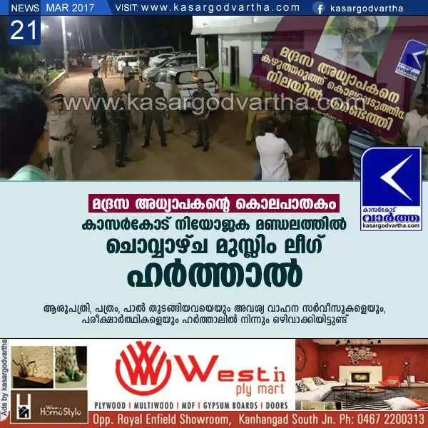 Keywords : Kasaragod, Harthal, Murder, Muslim-league, Murder, Madrasa teacher's murder; Muslim League calls for Hartal.