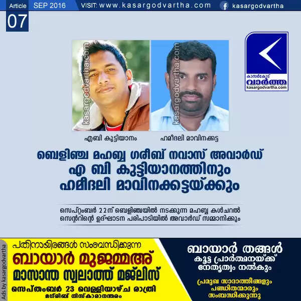 ബെളിഞ്ച: (www.kasargodvartha.com 07/09/2016) ബെളിഞ്ച മഹബ്ബ കള്‍ചറല്‍ സെന്റര്‍ ഏര്‍പെടുത്തിയ ഖാജാ ഗരീബ് നവാസ് അവാര്‍ഡിന് എബി കുട്ടിയാനത്തിനെയും ഹമീദലി മാവിനക്കട്ടെയെയും തെരെഞ്ഞടുത്തതായി ഭാരവാഹികള്‍ അറിയിച്ചു. പത്രപ്രവര്‍ത്തന രംഗത്തും തൂലികാ രംഗത്തും ശ്രദ്ധേയനായ എബി കുട്ടിയാനം സാമൂഹ്യ പ്രവര്‍ത്തന രംഗത്ത് സജീവ സാന്നിധ്യമാണ്. ബോവിക്കാനത്തെ പരേതനായ അബ്ദുര്‍ റഹ് മാനാണ് പിതാവ്. ബീഫാത്വിമയാണ് മാതാവ്.