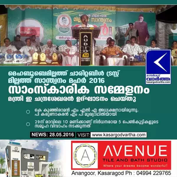 മെഹബൂബെമില്ലത്ത് ചാരിറ്റബിള് ട്രസ്റ്റ് മില്ലത്ത് സാന്ത്വനം മഹര് 2016; സാംസ്കാരിക സമ്മേളനം മന്ത്രി ഇ ചന്ദ്രശേഖരന് ഉദ്ഘാടനം ചെയ്തു