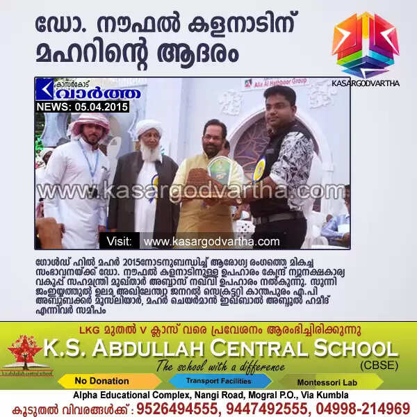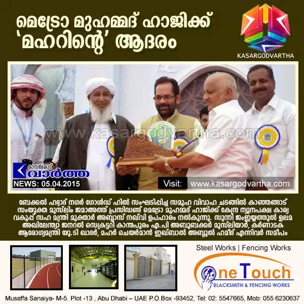 സാമൂഹ്യ - സാംസ്കാരിക രംഗത്തെ പ്രവര്ത്തനത്തിന് മെട്രോ മുഹമ്മദ് ഹാജിക്കും ആരോഗ്യ രംഗത്തെ സംഭാവനയ്ക്ക് ഡോ. നൗഫല് കളനാടിനും കേന്ദ്ര ന്യൂനപക്ഷകാര്യ വകുപ്പ് മന്ത്രി മുക്താര് അബ്ബാസ് നഖ്വി ഉപാഹം നല്കി. കര്ണാടക ആരോഗ്യ മന്ത്രി യു.ടി ഖാദര്, ഉദുമ എം.എല്.എ കെ. കുഞ്ഞിരാമന്. ഇ. ചന്ദ്രശേഖരന് എം.എല്.എ, തൃക്കരിപ്പൂര് എം.എല്.എ കെ. കുഞ്ഞിരാമന്, കര്ണാടക എം.എല്.എ മൊയ്തീന് ബാവ, മുന് മന്ത്രി ചെര്ക്കളം അബ്ദുല്ല, പള്ളങ്കോട് അബ്ദുല് ഖാദര് മദനി, കെ.പി.സി.സി ജനറല് സെക്രട്ടറി കെ.പി കുഞ്ഞിക്കണ്ണന്, എസ്.ഡി.പി.ഐ ജില്ലാ പ്രസിഡണ്ട് എന്.യു അബ്ദുല് സലാം,