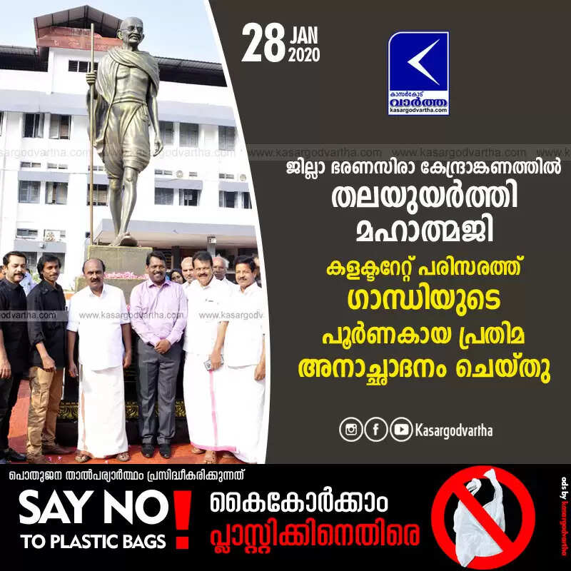 ജില്ലാ ഭരണസിരാ കേന്ദ്രാങ്കണത്തില് തലയുയര്ത്തി മഹാത്മജി; കളക്ടറേറ്റ് പരിസരത്ത് ഗാന്ധിയുടെ പൂര്ണകായ പ്രതിമ അനാച്ഛാദനം ചെയ്തു