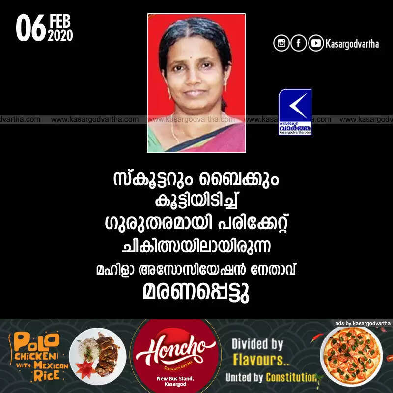 സ്കൂട്ടറും ബൈക്കും കൂട്ടിയിടിച്ച് ഗുരുതരമായി പരിക്കേറ്റ് ചികിത്സയിലായിരുന്ന മഹിളാ അസോസിയേഷന് നേതാവ് മരണപ്പെട്ടു