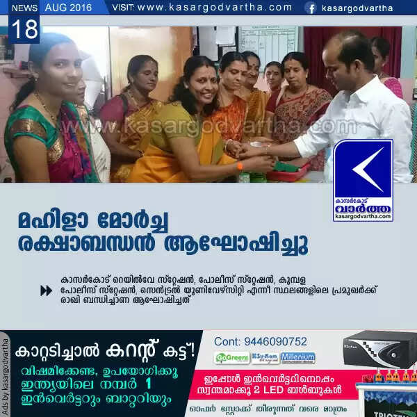 കാസര്‍കോട്: (www.kasargodvartha.com 18/08/2016) ഭാരതീയ ജനതാ മഹിള മോര്‍ച്ചയുടെ നേതൃത്വത്തില്‍ വിവിധ സ്ഥലങ്ങളില്‍ രക്ഷാബന്ധന്‍ ആഘോഷിച്ചു. കാസര്‍കോട് റെയില്‍വേ സ്‌റ്റേഷന്‍, പോലീസ് സ്‌റ്റേഷന്‍, കുമ്പള പോലീസ് സ്‌റ്റേഷന്‍, സെന്‍ട്രല്‍ യൂണിവേഴ്‌സിറ്റി എന്നീ സ്ഥലങ്ങളിലെ പ്രമുഖര്‍ക്ക് രാഖി ബന്ധിച്ചാണ് അഘോഷിച്ചത്.