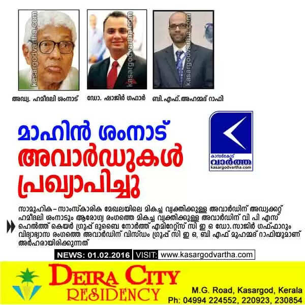 ദുബൈ: (www.kasargodvartha.com 02.01.2016) ഉത്തര മലബാറില് മുസ്ലിം പിന്നോക്ക വിഭാഗത്തിന്റെ ഉന്നമനത്തിനായി ജീവിതം മാറ്റി വെച്ച മഹദ്വ്യക്തിത്വമായ മാഹിന് ശംനാടിന്റെ സ്മരണാര്ത്ഥം യു എ ഇ - കെ എം സി സി ചെമ്മനാട് മേഖല കമ്മിറ്റി സാമൂഹ്യ-സാംസ്കാരിക-ആരോഗ്യ-വിദ്യാഭ്യാസ രംഗത്തെ മികച്ച പ്രതിഭകള്ക്കായി ഏര്പ്പെടുത്തിയ അവാര്ഡുകള് പ്രഖ്യാപിച്ചു.