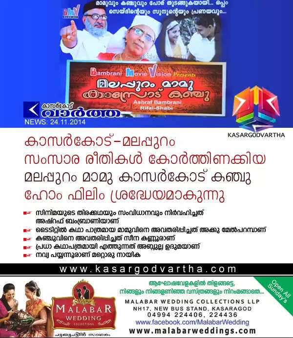 കാസര്‍കോട്: (www.kasargodvartha.com 24.11.2014) മലപ്പുറത്തേയും കാസര്‍കോട്ടേയും ഭാഷാ സംസ്‌ക്കാരങ്ങള്‍ കോര്‍ത്തിണക്കിയ മലപ്പുറം മാമു കാസര്‍കോട് കഞ്ചു ഹോം സിനിമ ശ്രദ്ധേയമാകുന്നു. ഇരട്ട പ്രണയവും ഇതിലെ നായികാ നായകന്മാര്‍ പിന്നീട് ശത്രുകളാകുന്നതുമാണ് സിനിമയുടെ ഇതിവൃത്തം. 1.45 മണിക്കൂര്‍ ദൈര്‍ഘ്യമുള്ള സിനിമയുടെ തിരക്കഥയും സംവിധാനവും നിര്‍വഹിച്ചത് അഷ്‌റഫ് ബംബ്രാണിയാണ്.