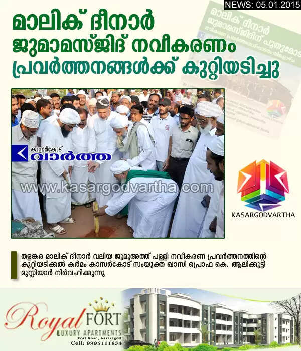 (www.kasargodvartha.com 05/01/2015) മാലിക് ദിനാര് വലിയ ജുമാമസ്ജിദ് നവീകരണ പ്രവര്ത്തനത്തിന്റെ ഭാഗമായി നിര്മാണ പ്രവര്ത്തനങ്ങള്ക്ക് കാസര്കോട് സംയുക്ത ഖാസി പ്രൊഫ. ആലിക്കുട്ടി മുസ്ലിയാര് കുറ്റിയടിച്ചു.