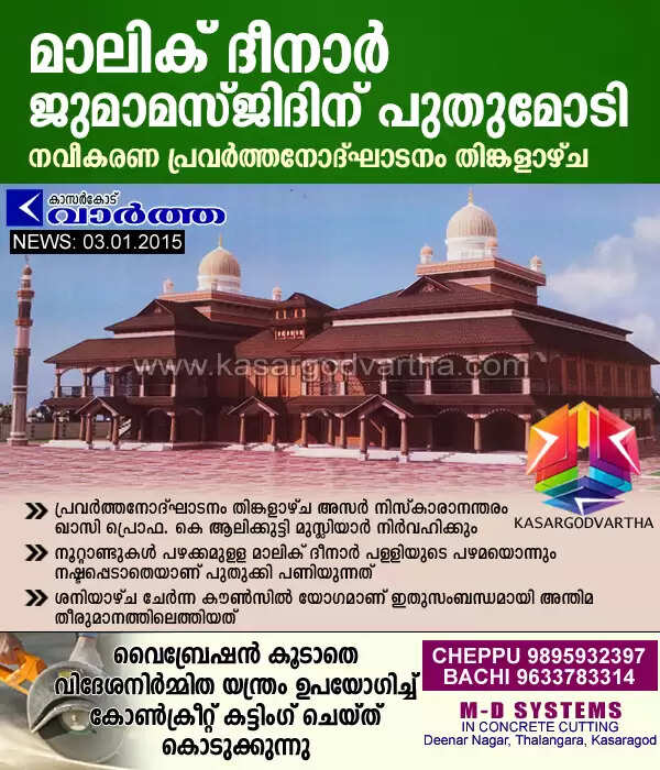മാലിക് ദീനാര് വലിയ ജുമാമസ്ജിദിന് പുതുമോടി; നവീകരണ പ്രവര്ത്തനോദ്ഘാടനം തിങ്കളാഴ്ച