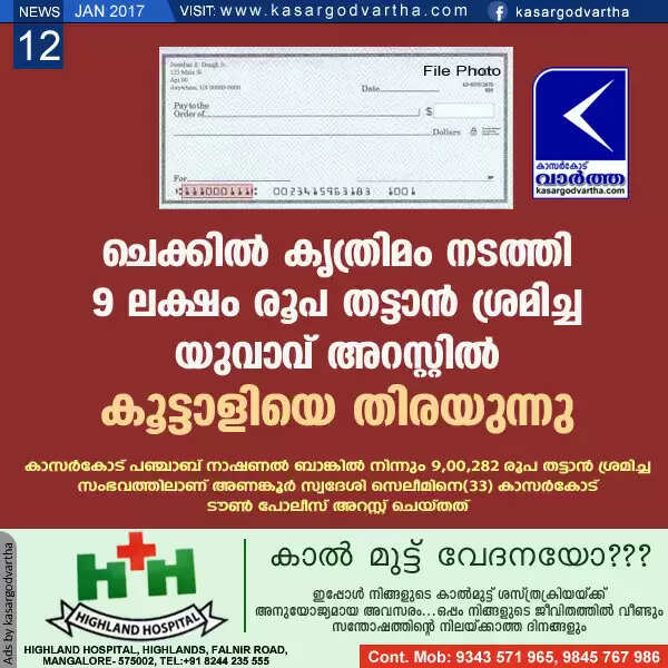 കാസര്കോട്: (www.kasargodvartha.com 12/01/2017) ചെക്കില് കൃത്രിമം നടത്തി 9 ലക്ഷം രൂപ തട്ടാന് ശ്രമിച്ച യുവാവ് അറസ്റ്റില്. കൂട്ടാളിയെ തിരയുന്നു. കാസര്കോട് പഞ്ചാബ് നാഷണല് ബാങ്കില് നിന്നും 9,00,282 രൂപ തട്ടാന് ശ്രമിച്ച സംഭവത്തിലാണ് അണങ്കൂര് സ്വദേശി സെലീമിനെ(33) കാസര്കോട് ടൗണ് പോലീസ് അറസ്റ്റ് ചെയ്തത്.