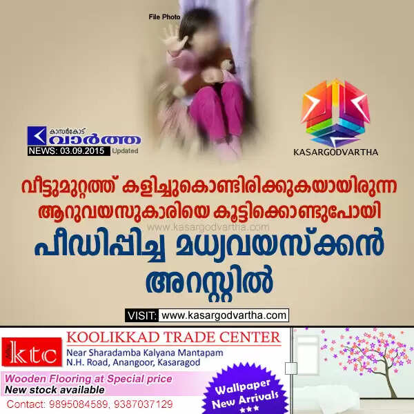 വീട്ടുമുറ്റത്ത് കളിച്ചുകൊണ്ടിരിക്കുകയായിരുന്ന ആറുവയസുകാരിയെ കൂട്ടിക്കൊണ്ടുപോയി പീഡിപ്പിച്ച മധ്യവയസ്‌ക്കന്‍ അറസ്റ്റില്‍
