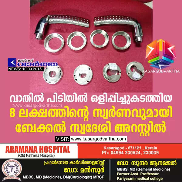 വാതില് പിടിയില് ഒളിപ്പിച്ചുകടത്തിയ 8 ലക്ഷത്തിന്റെ സ്വര്ണവുമായി ബേക്കല് സ്വദേശി അറസ്റ്റില്