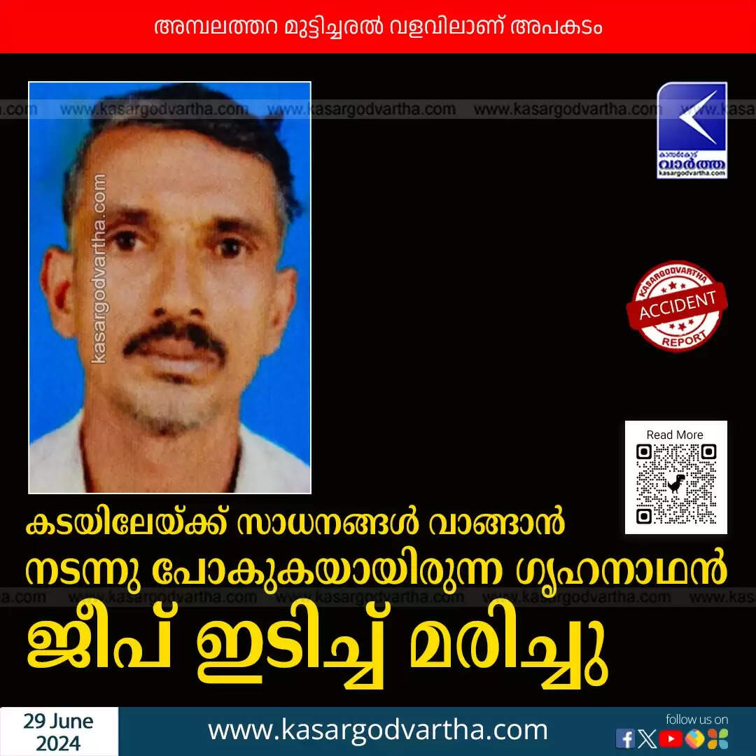 Accident | കടയിലേയ്ക്ക് സാധനങ്ങള് വാങ്ങാന് നടന്നു പോകുകയായിരുന്ന ഗൃഹനാഥന് ജീപ് ഇടിച്ച് മരിച്ചു