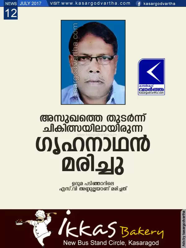 ഉദുമ: (www.kasargodvartha.com 12.07.2017) അസുഖത്തെ തുടര്ന്ന് ചികിത്സയിലായിരുന്ന ഗൃഹനാഥന് മരിച്ചു. ഉദുമ പടിഞ്ഞാറിലെ എസ്.വി അബ്ദുല്ല (63)യാണ് മരിച്ചത്. ഉദുമ പടിഞ്ഞാര് മുസ്ലിം ജമാഅത്ത് കമ്മിറ്റി ജനറല് സെക്രട്ടറിയും ഉദുമക്കാര് കൂട്ടായ്മ അംഗവുമായിരുന്നു. അസുഖം ബാധിച്ചതിനെ തുടര്ന്ന് ചികിത്സയിലായിരുന്നു. ചൊവ്വാഴ്ച രാത്രി മംഗളൂരുവിലെ ആശുപത്രിയില് വെച്ചായിരുന്നു അന്ത്യം.