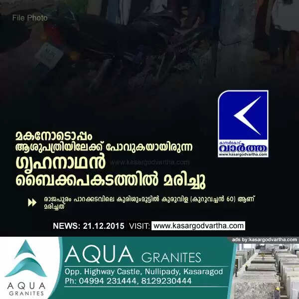 രാജപുരം: (www.kasargodvartha.com 21/12/2015) മകനോടൊപ്പം ആശുപത്രിയിലേക്ക് പോവുകയായിരുന്ന പിതാവ് ബൈക്കപകടത്തില് മരിച്ചു. പാറക്കടവിലെ കുരിശുംമൂട്ടില് കുരുവിള (കുറുവച്ചന് 60) ആണ് മരിച്ചത്. മകന് സഞ്ജിത്തിനെ പരിക്കുകളോടെ കാഞ്ഞങ്ങാട്ടെ സ്വകാര്യ ആശുപത്രിയില് പ്രവേശിപ്പിച്ചു. തിങ്കളാഴ്ച വൈകുന്നേരം പാണത്തൂര് ചെമ്പേരിയിലെ ബസ് സ്റ്റാന്ഡ് പരിസരത്തായിരുന്നു അപകടം.