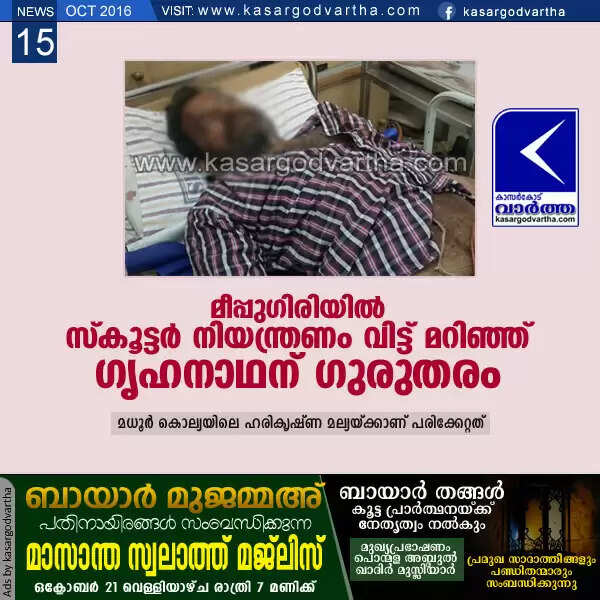 Keywords : Kasaragod, Accident, Injured, Hospital, Scooter, Police, Meepugiri, Harikrishna Malya, Man injured in accident.