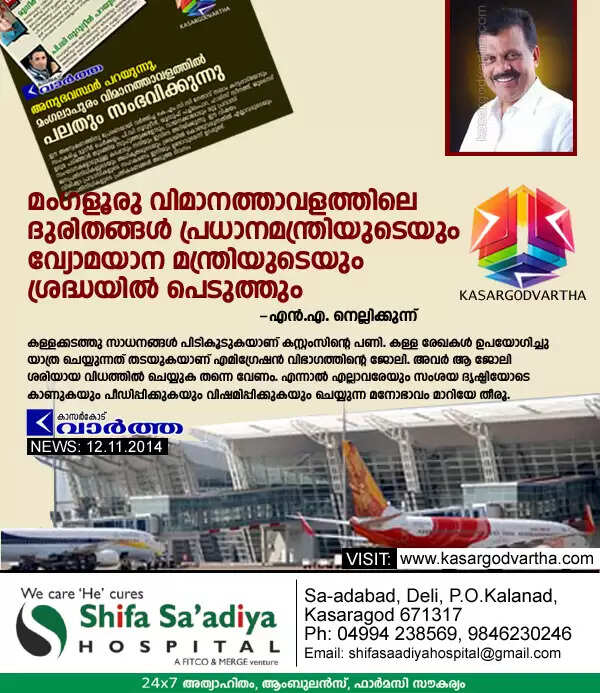 കാസര്കോട്: (www.kasargodvartha.com 12.11.2014) മംഗളൂരു അന്താരാഷ്ട്ര വിമാനത്താവളത്തില് യാത്രക്കാര്ക്കു നേരെയുണ്ടാകുന്ന പീഡനങ്ങള് സംബന്ധിച്ച് പ്രധാന മന്ത്രിക്കും കേന്ദ്ര വ്യോമയാന മന്ത്രിക്കും പരാതി നല്കുമെന്ന് എന്.എ. നെല്ലിക്കുന്ന് എം.എല്.എ. പറഞ്ഞു. വിമാനത്താവളത്തില് പ്രവാസികളായ കാസര്കോട്ടുകാരുള്പെടെയുള്ളവര്ക്കുണ്ടാകുന്ന പ്രശ്നങ്ങളും പരാതികളും സംബന്ധിച്ച് കാസര്കോട്വാര്ത്ത നടത്തിയ അന്വേഷണത്തെ തുടര്ന്ന് പ്രസിദ്ധീകരിച്ച വാര്ത്തയോട് പ്രതികരിക്കുകയായിരുന്നു അദ്ദേഹം.
