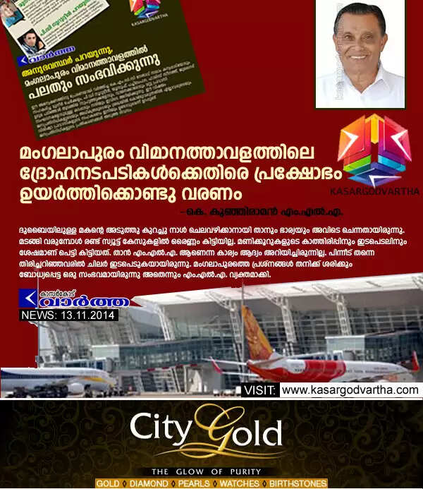 കാസര്‍കോട്: (www.kasargodvartha.com 13.11.2014) മംഗളൂരു വിമാനത്താവളത്തില്‍ യാത്രക്കാര്‍ക്കു നേരെ അധികൃതരുടെ ഭാഗത്തു നിന്നുണ്ടാകുന്ന ദ്രോഹ നടപടികള്‍ക്കെതിരെ ശക്തമായ പ്രക്ഷോഭം ഉയര്‍ത്തിക്കൊണ്ടു വരണമെന്ന് ഉദുമ എം.എല്‍.എ. കെ. കുഞ്ഞിരാമന്‍ പറഞ്ഞു. വിമാനത്താവളത്തിലെ പ്രശ്‌നങ്ങളും പരാതികളും സംബന്ധിച്ച് കാസര്‍കോട് വാര്‍ത്ത പ്രസിദ്ധീകരിച്ച വാര്‍ത്തകളോട് പ്രതികരിക്കുകയായിരുന്നു എം.എല്‍.എ.