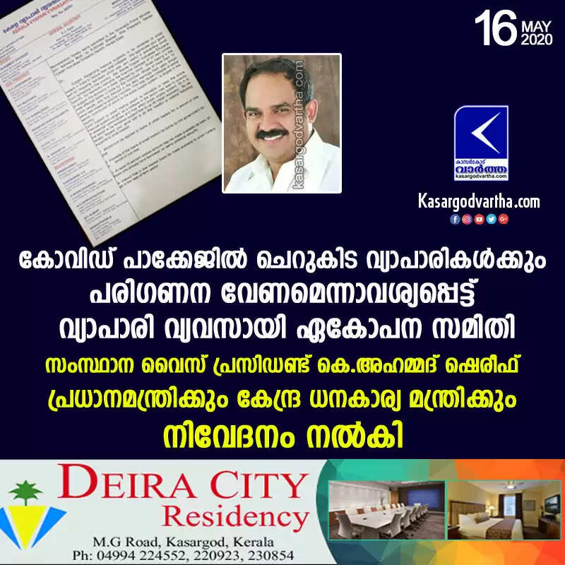കാസര്കോട്: (www.kasargodvartha.com 16.05.2020) കേന്ദ്ര സര്ക്കാറിന്റെ കൊവിഡ് പാക്കേജില് ചെറുകിട വ്യാപാരികളെയും പരിഗണിക്കണമെന്ന് ആവശ്യപ്പെട്ട് വ്യാപാരി വ്യവസായി ഏകോപന സമിതി സംസ്ഥാന വൈസ് പ്രസിഡണ്ട് കെ.അഹമ്മദ് ഷെരീഫ് പ്രധാനമന്ത്രിക്കും കേന്ദ്ര ധനകാര്യ മന്ത്രിക്കും നിവേദനം നല്കി