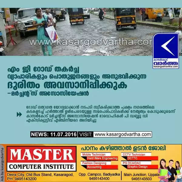 എം ജി റോഡ് തകര്ച്ച: വ്യാപാരികളും പൊതുജനങ്ങളും അനുഭവിക്കുന്ന ദുരിതം അവസാനിപ്പിക്കുക: മര്ച്ചന്റ്സ് അസോസിയേഷന്