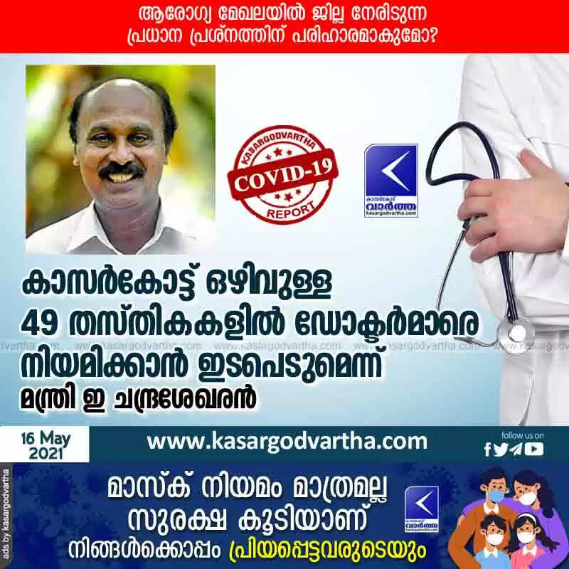 കാസർകോട്ട് ഒഴിവുള്ള 49 തസ്തികകളിൽ ഡോക്ടർമാരെ നിയമിക്കാൻ ഇടപെടുമെന്ന് മന്ത്രി ഇ ചന്ദ്രശേഖരൻ