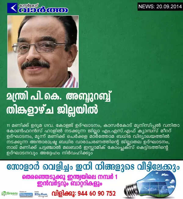 Keywords : Kasaragod, Kerala, Minister, Minister P.K Abdu rabb, Visits, Inauguration,Minister P.K Abdu rabb to visit Kasargod.