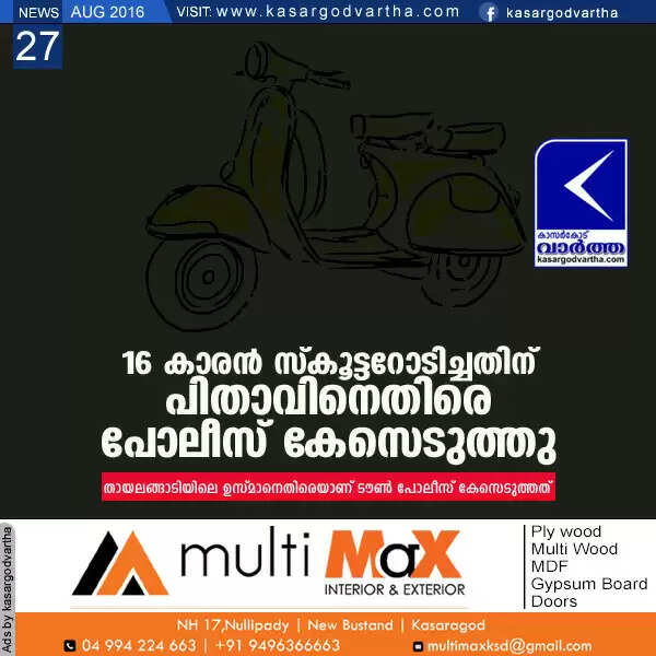 Keywords : Kasaragod, Scooter, Driver, Case, Father, Police, Thalangara, Thayalangadi, Minor driving: Case against father.