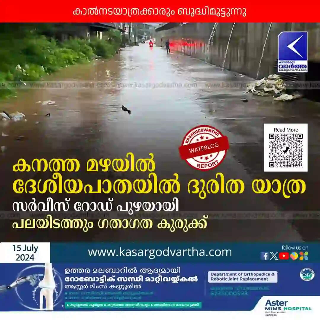 മൊഗ്രാൽ ദേശീയപാതയിൽ സർവീസ് റോഡിൽ വലിയ തോതിലുള്ള വെള്ളക്കെട്ട് വാഹനഗതാഗതത്തെ ബാധിച്ചു. എങ്ങും സർവീസ് റോഡുകളിൽ മുട്ടോളം വെള്ളക്കെട്ടാണ് കാണാൻ കഴിയുന്നത്. അശാസ്ത്രീയമായി നിർമിച്ച ഓവുചാലുകളൊക്കെ മഴവെള്ളപ്പാച്ചിലിൽ നോക്കുകുത്തിയായി മാറി. പലയിടത്തും ഓവുചാലുകളുടെ പണി പാതിവഴിയിലുപേക്ഷിച്ചത് ദുരിതത്തിന് കാരണമായി.